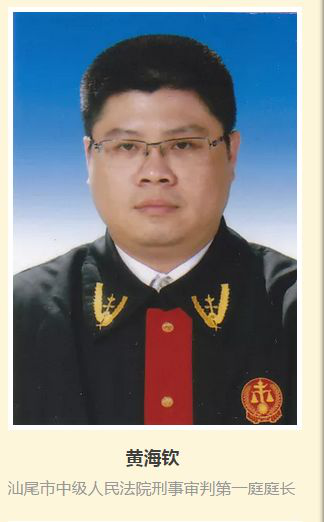 黄海钦于1997年9月就读于广东商学院国际经济法专业。在校期间,担任班级、学生会干部,学习成绩优异,工作认真负责。2001年毕业后参加工作。现任汕尾市中级人民法院审判委员会委员,刑事审判第一庭庭长,四级高级法官。