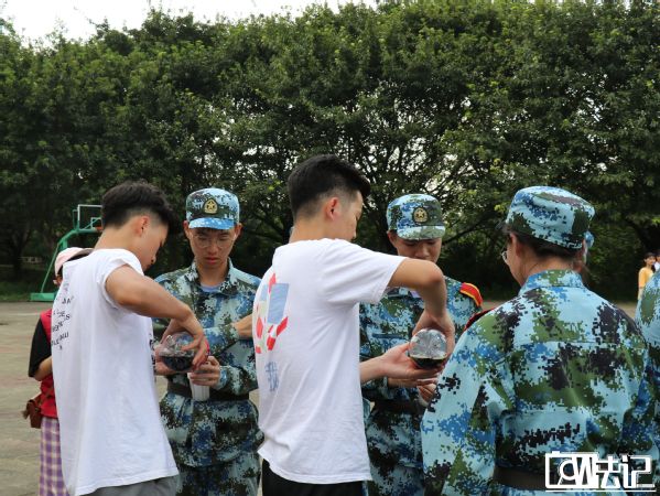 班助团不仅为新生们携来一阵清凉,更是带去一份欢乐。19级班助曾佩芹应新生们邀请其唱歌的呼声,带来了一曲《小幸运》,给他们为期14天的军旅生活增添一抹乐趣。新生们一边欣赏着美妙的歌声,一边畅饮冰爽的可乐,也有的跟着一起哼唱,此时,快乐变得如此简单。