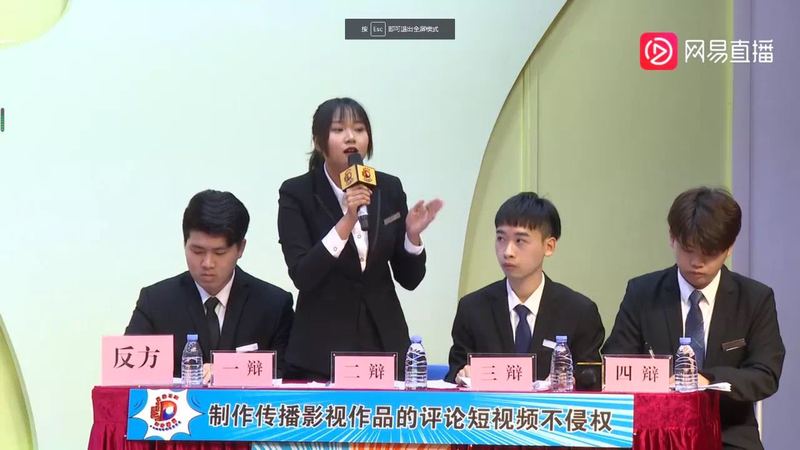 赛场上,双方辩手就“制作传播影视作品的评论短视频是否侵权?”的辩题展开激烈辩论,华南师范大学持正方立场,我校持反方立场。我方二辩叶晓丹同学逻辑清晰,镇定自若,妙语连珠,荣获本场比赛的“最佳辩手”!