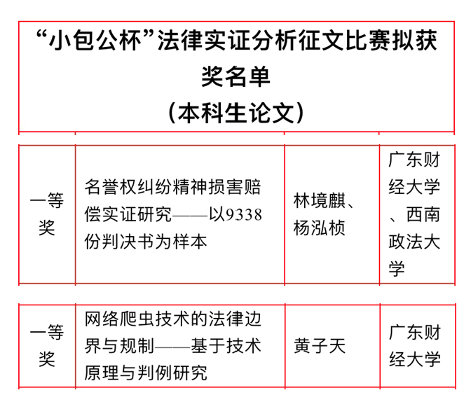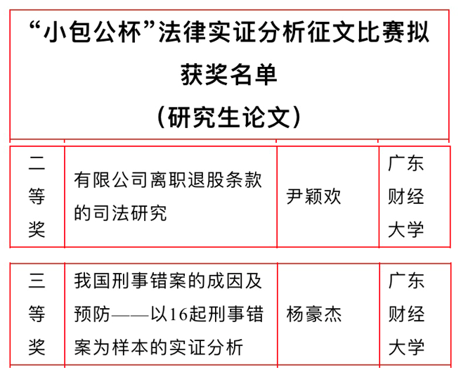 新葡的京集团35222vip林境麒《名誉权纠纷精神损害赔偿实证研究——以9338份判决书为样本》、黄子天《网络爬虫技术的法律边界与规制——基于技术原理与判例研究》荣获本科组论文一等奖;尹颖欢《有限公司离职退股条款的司法研究》荣获研究生组论文二等奖;杨豪杰《我国刑事错案的成因及预防——以16起刑事错案为样本的实证分析》荣获研究生组论文三等奖。