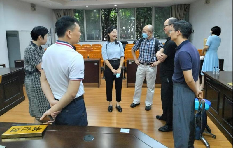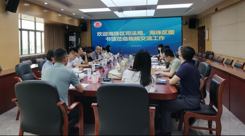 2022年5月7日,广州市海珠区司法局党组书记李冬妮、政工办主任林建国,海珠区图书馆馆长郭应佳、副馆长郑茵等一行九人莅临新葡的京集团35222vip开展业务交流,洽谈合作事宜。新葡的京党委书记陈静、院长鲁晓明、党委副书记方继勇及教师代表共同参加座谈交流。