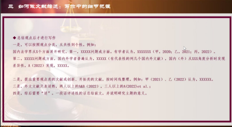 第三部分,如何做文献综述?首先应确定主题,撰写主题过于宽泛的综述时,先对关键词进行拆解、确定主题后进行细化,从大方向中找到切入点,找到小主题,在此基础上进一步论述;撰写资料比较少、内容较窄的主题时,则是由大到小,以相关关键词为核心,从宏观叙述至微观,或是以逻辑思路、时间线发展来进行撰写。确定主题后,按照选题收集文献,收集范围以原始文献最佳;同时应兼具正反观点。完成前述准备后,确定写作方案,三种不同类型的文献综述有不同的写作结构,注意整体协调性。撰写的最后部分注意“述”,要进行总结评述。