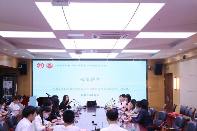 党建活动第三项议程,由中国工商银行股份有限公司广州分行人力资源部总经理杨扬对银行业法学专业人才需求的情况进行介绍,广州分行法律部总经理袁敏介绍银行业法务部门的相关工作内容及职业发展前景。
