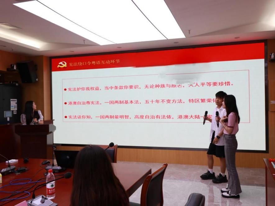 在活动第四个环节,为庆祝中国共产党建党101周年,同时庆祝香港回归25周年,进行用粤语朗读宪法绕口令这一具有南粤学子特色的互动环节,会计学院郑梓龙同志和新葡的京集团35222vip陈金璐同志踊跃举手进行了朗读,最后新葡的京集团35222vip冼皓同志和马芳婷同志带领全体参会人员朗读了宪法粤语绕口令,为党的生日送上真挚的祝福。