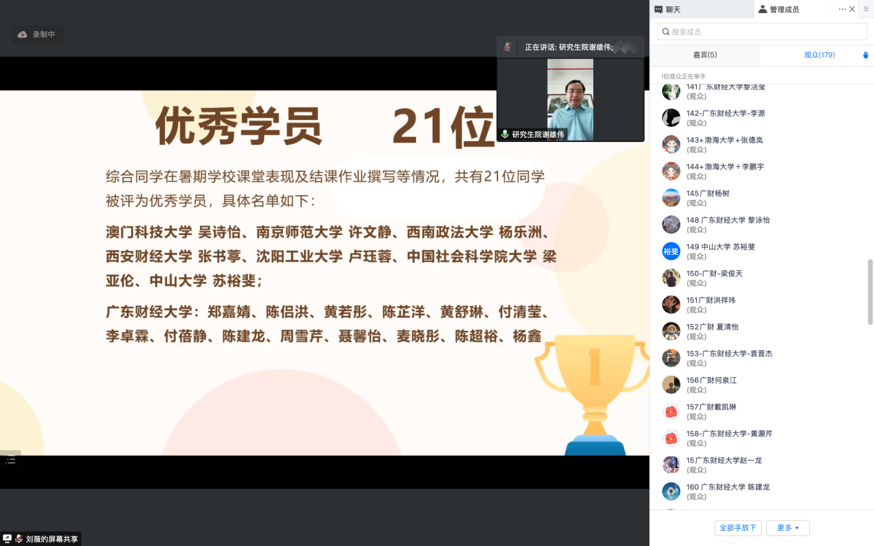 刘薇主持结业典礼。总结本次暑期学校出勤、上课讨论、结课论文等情况,对能够顺利结业的同学表示祝贺。