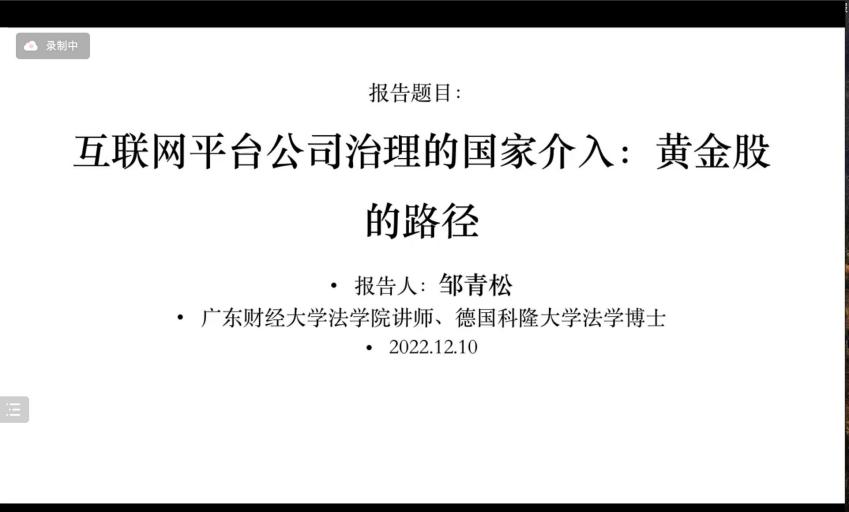 紧接着我校邹青松博士所做报告题目为《互联网平台公司治理的国家介入:黄金股的路径》,他从重思国家在互联网平台公司治理的角色、黄金股的域内外实践经验及借鉴、引入互联网平台公司治理的黄金股,最终到构建互联网平台黄金股的实施机制。他系统性地回答了当今互联网平台崛起及其伴随的公共利益、国家安全损害风险,并且证成了黄金股在我国的实行的正当性和必要性。