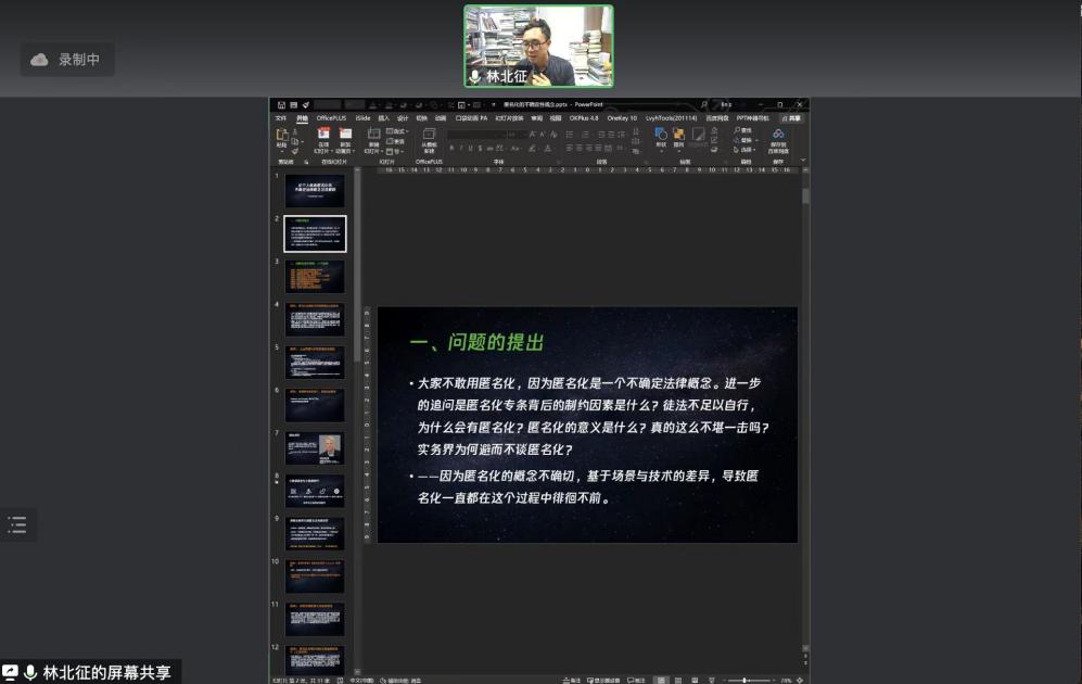 赵教授演讲后,由广州互联网法院的林北征博士发言。他的演讲题目是《论个人信息匿名化的不确定法律概念及其解释》。他首先阐明了匿名化无法被大规模适用的现状,由此引出了其在现实中的十大困境。在此基础上,他又进一步论述了匿名化处理的立法优势,包括保障不受保留时间限制、避免突袭执法、降低数据复用合规性风险等。最后,回归实践,林北征认为其关键在于增程式解释,同时指明必须着力于自我规制及对自我规制的规制,由理想回归经验现实,保障匿名化处理发挥其功能与价值。