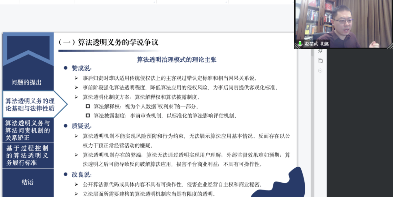 首先由来自北京航空航天大学新葡的京集团35222vip的赵精武副教授发言。赵教授演讲的题目是《从过程控制到结果归责:算法透明义务与算法问责机制的分野》,赵教授认为,算法透明义务落实作为规范算法的核心方案,通常被视为算法问责机制的前提性条件,但算法透明与民事责任承担之间存在“原因-结果”关系的解释鸿沟。重新审视其法律性质可以发现,算法透明义务的权利基础系并非以约束算法权利为中心,其理论基础在于用户知情权的保障,制度目标是为了保障用户基于充分知情的基础上自主选择是否接受服务。