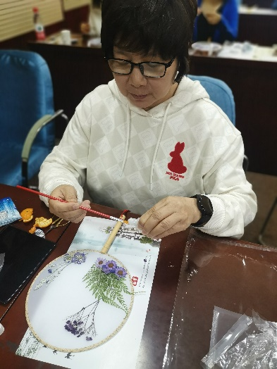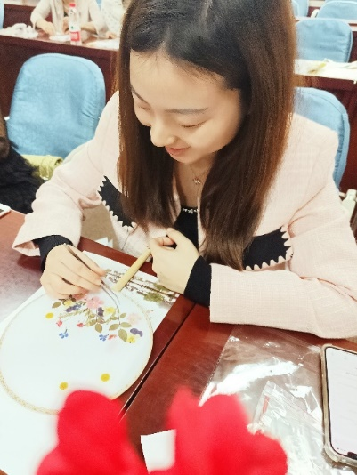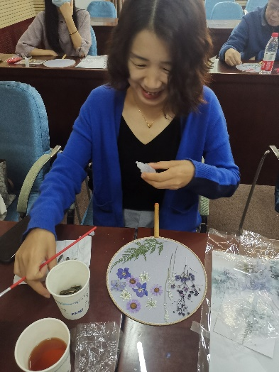 活动现场,学院分工会聘请了公司专业培训师。首先,培训师向各位老师介绍了团扇的文化及寓意,接着细心指导各位老师如何固定花瓣、安放干花、造型插花等。女教师们一边聆听培训师的讲解,一边拿着镊子和剪刀、干花纷纷尝试。