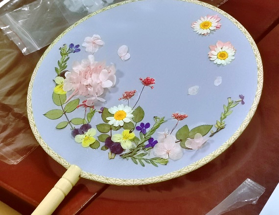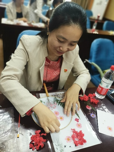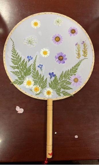 活动过程中,女老师们充分发挥想象力和创造力,精巧构思,调整花材位置,相互交流借鉴。不一会儿,大家就创造出了一个个清新淡雅、形态优美的团扇作品。大家相互欣赏,充分享受动手DIY的乐趣,活动氛围融洽。