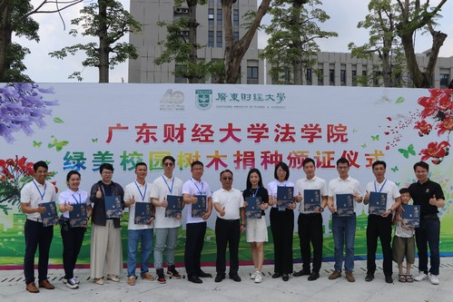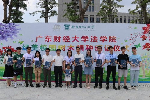 郑贤操致辞。他代表学校向捐种树木的法学校友们表达了诚挚的谢意。他强调,学校未来的长远发展离不开校友们的支持,期待校友们持续关注关心学校发展建设并建言献策。郑贤操、于海峰、罗贤甲分别为捐种树木的校友颁发捐种证书并合影留念,现场气氛热烈。