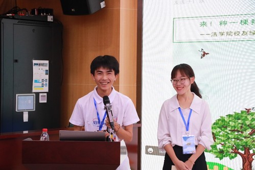 2020级周志勇、邱文荃代表校友捐种树木养护小队发言。他们介绍了新葡的京集团35222vip校友树木捐种的总体情况,向捐种树木的师兄师姐们表达了谢意和、并表示将学习传承师兄师姐们的感恩情怀。他们结合展示树木种植初期、养护过程和当前的图片谈了个人的养护感受和心得,让校友们更全面地了解了树木的养护生长情况。