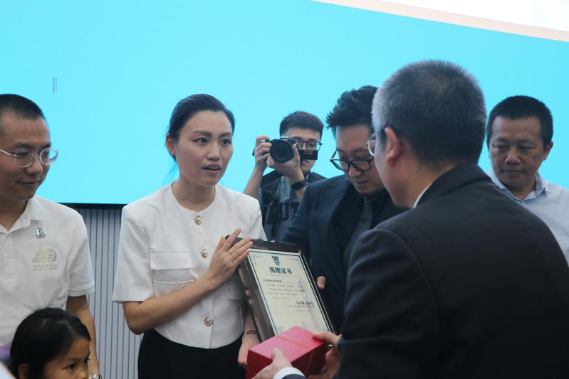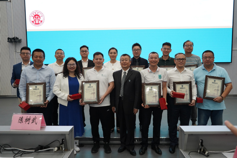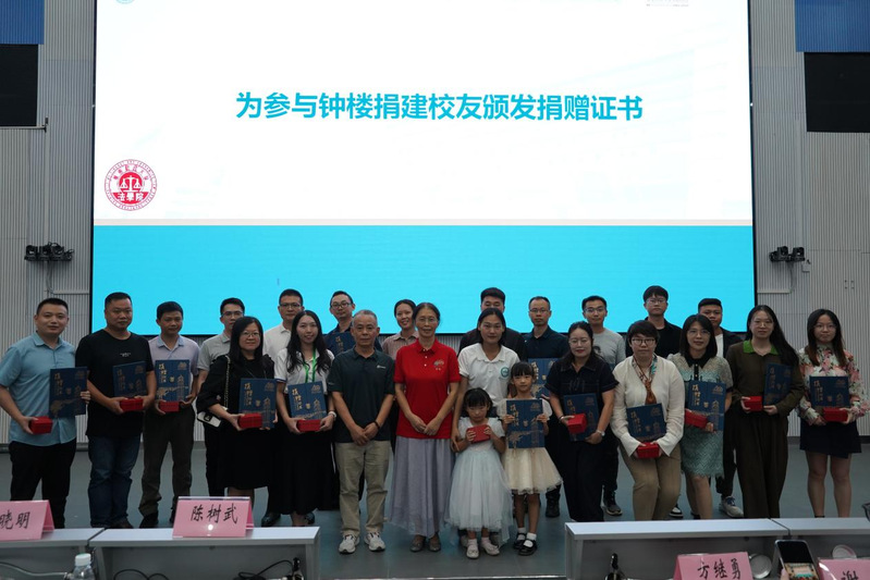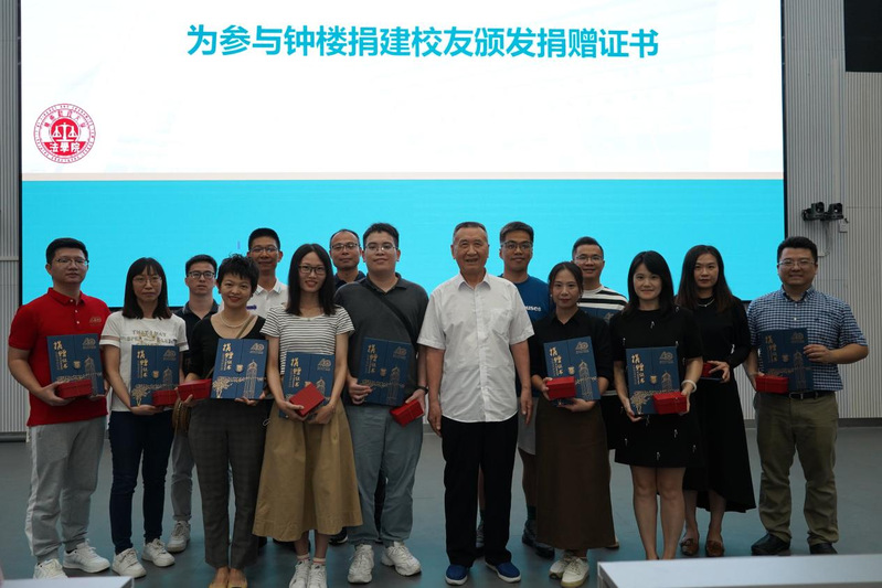 仪式现场,陈树武为捐建钟楼做出突出贡献的校友颁发定制证书和捐赠鸣谢水晶纪念品。